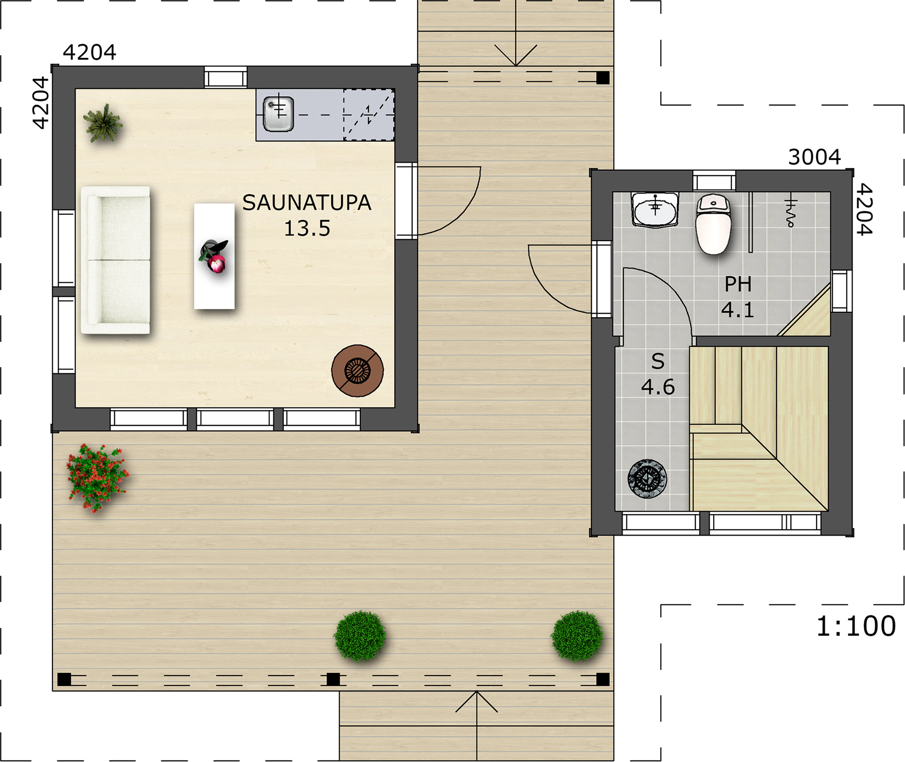 - Обшивка снаружи: планкен — сосна, металлический сайдинг.