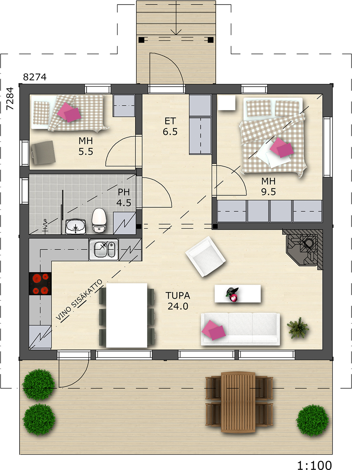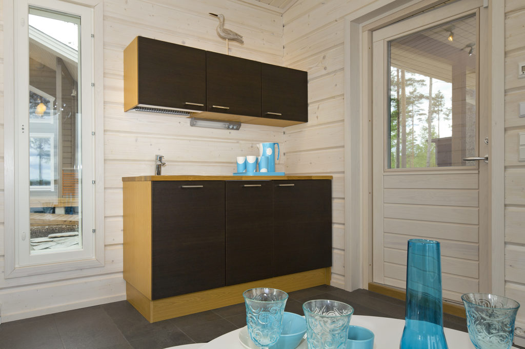 - Обшивка внутри: брошированная имитация бруса, окрашена пропиткой Тikkurilа.